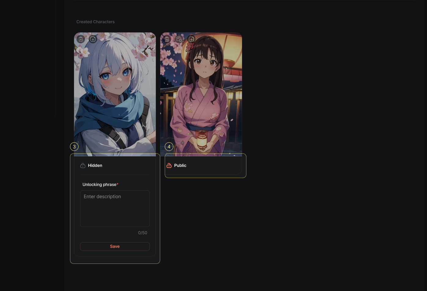 Private: Only you can see and chat with the character.