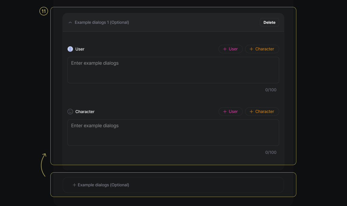 Add example dialogues to clarify how your character speaks and behaves. The more examples you provide, the better the system understands their tone, vocabulary, and personality.