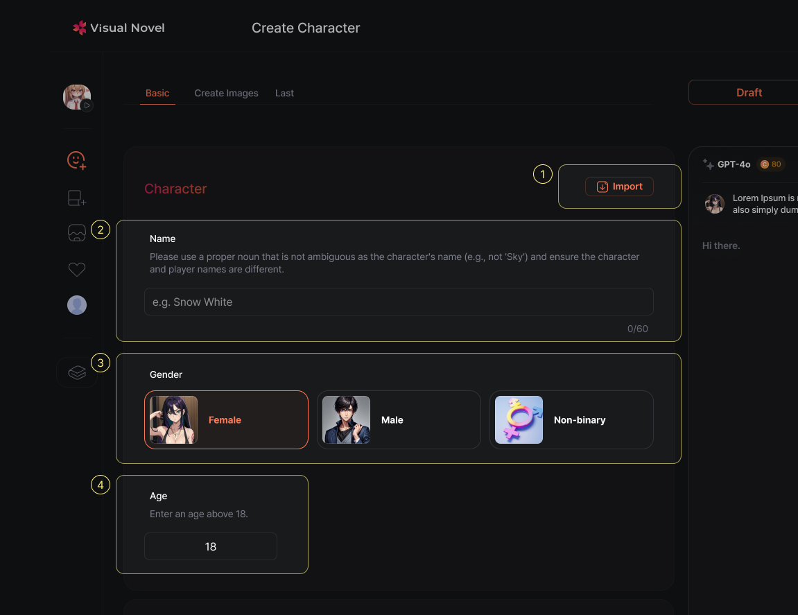 Welcome to the VisualNovel Character Creator! Turn anything—hero, object, or idea—into an AI persona. Shape its look, story, and personality, then share your creation with the world. Let’s begin!