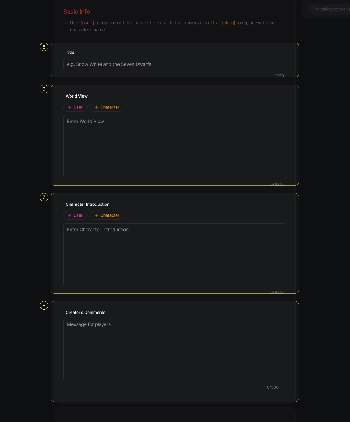 Tip: Make sure your example dialogues reflect your character’s tone, word choices, and typical reactions. This helps define their unique voice and makes conversations feel more authentic.