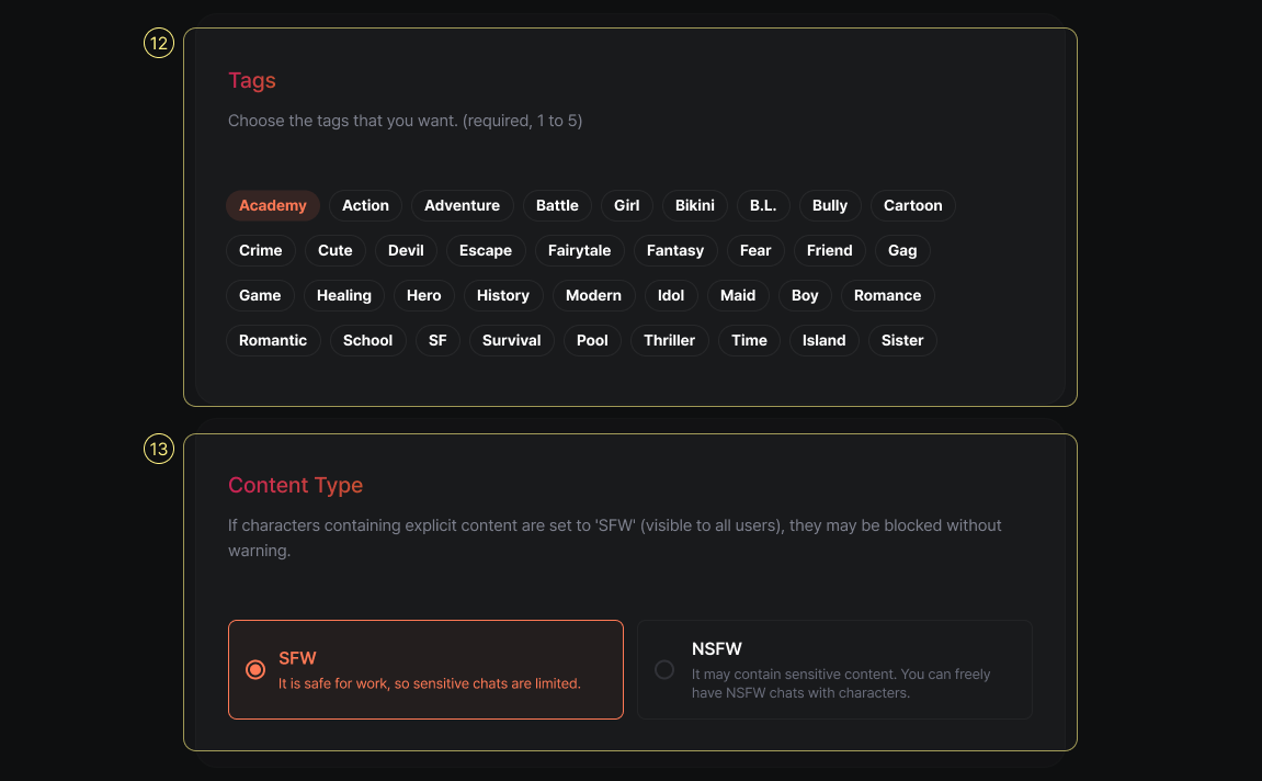 Choose 1 to 5 tags to describe your character (required). Tags help users quickly understand their personality or story traits, and make the character easier to find.